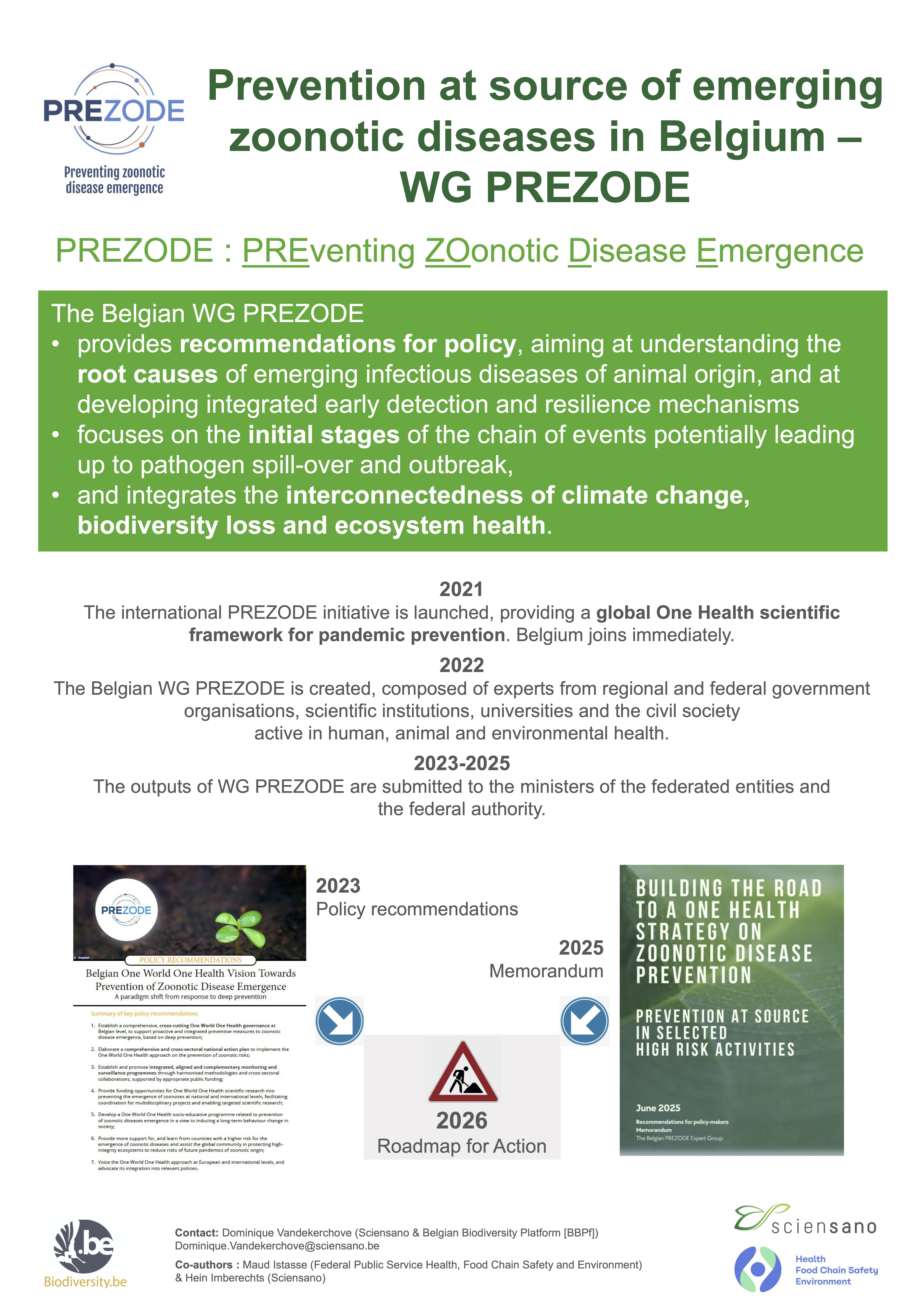 At the 3 December 2025 edition, One Health expert Dominique Vandekerchove presented the poster “Prevention at source of emerging zoonotic diseases in Belgium – WG PREZODE”, which highlights the PREZODE initiative. The poster was co-authored with Maud Istasse (FPS Health, Food Chain Safety and Environment) and Hein Imberechts (Sciensano).