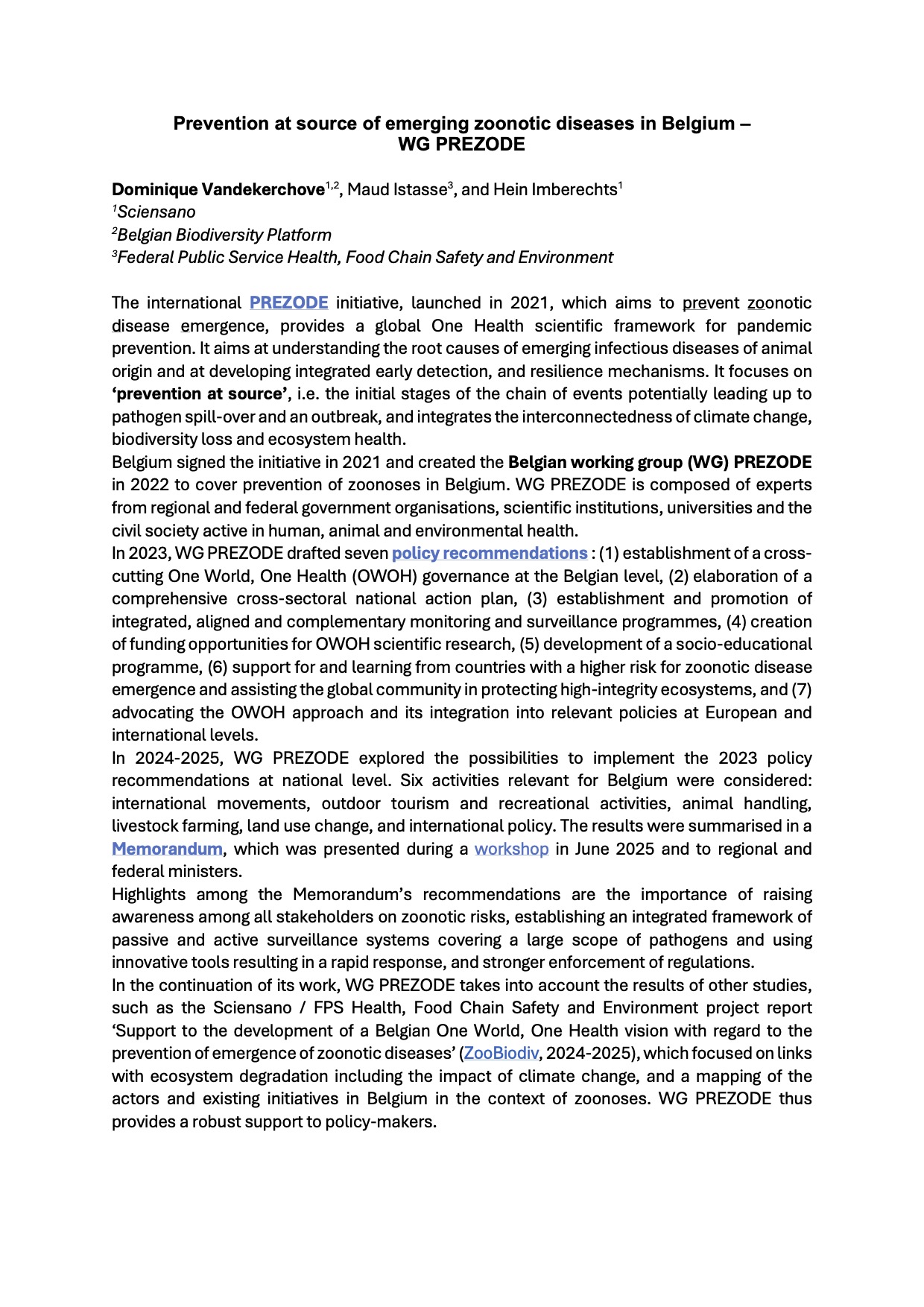 Over the course of 2023, the Belgian PREZODE Expert Group — with support from the Belgian Biodiversity Platform, FPS Health, Food Chain Safety and Environment and Sciensano — organised a series of three workshops to discuss and develop a national One World One Health vision for Belgium, with a focus on the emergence of zoonotic diseases.